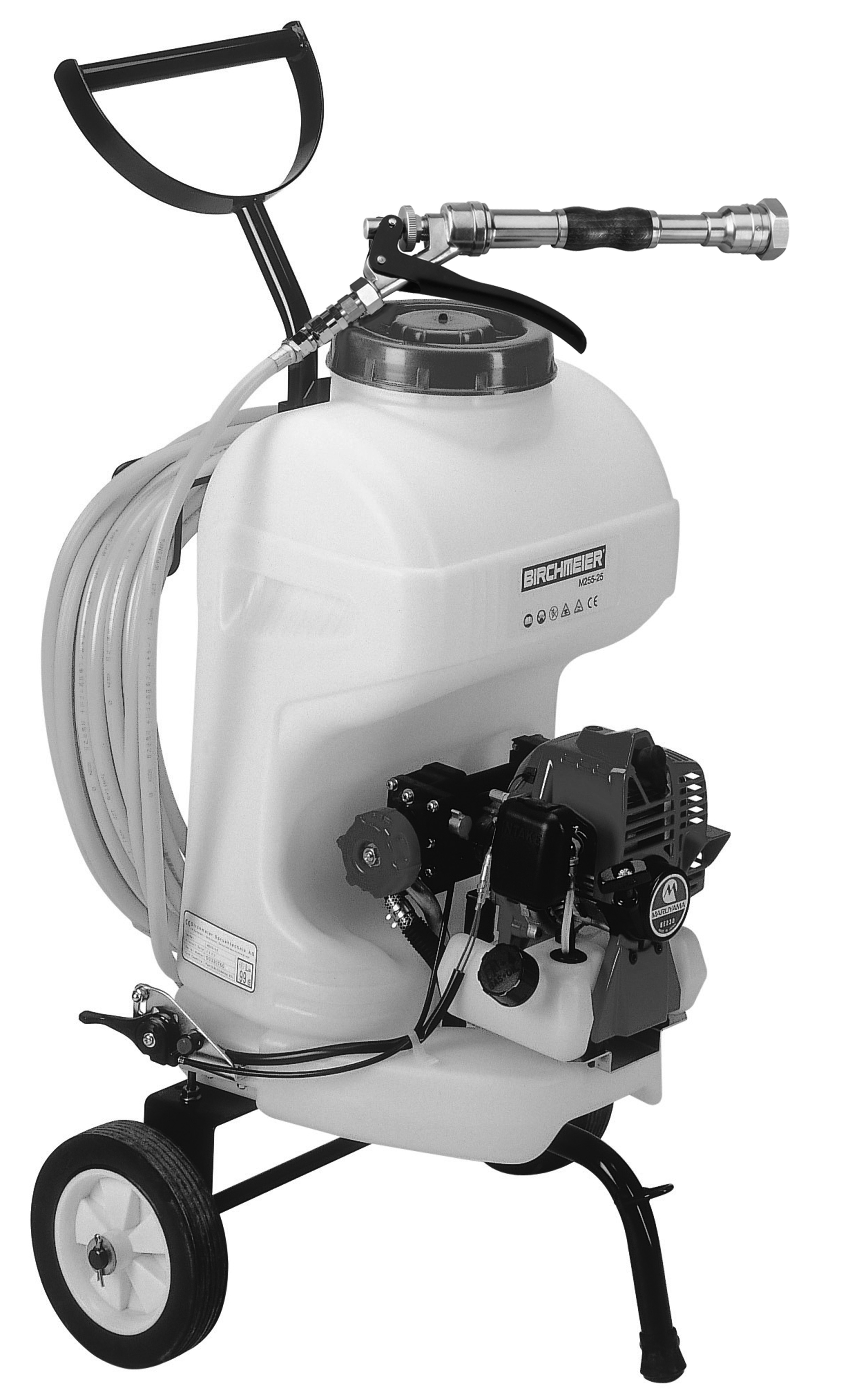 Artikelnummer: 11445410 / EAN: 7611034210155-NIET MEER VERKRIJGBAAR- Trekken ipv dragen! Duurzame sproeier op twee wielen, luchtgekoelde 2-taktmoter (0.7 kW/0.9pk/7000 o/min), carburator met gesloten membraan, elektronische ontsteking en pomp met dubbele zuiger. Omwille van het hoge debiet en de hoge werkdruk ideaal geschikt voor sproeirevolvers zoals de Gun Media voor bomen en hagen.